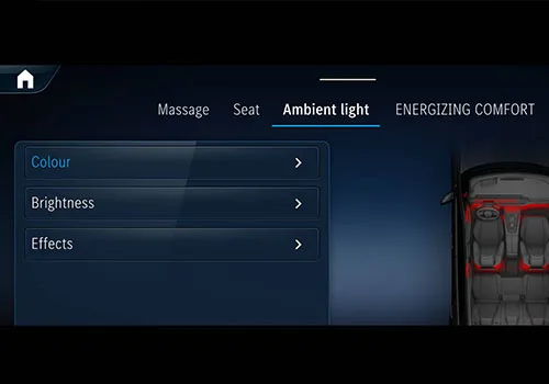 Standard equipment Immerse the interior in atmospheric light: The ambient lighting offers a total of 64 colors to create the perfect lighting scheme – tailored to your personal preference. The colors can also be spectacularly varied across 9 color schemes. Additional white light elements aid orientation.